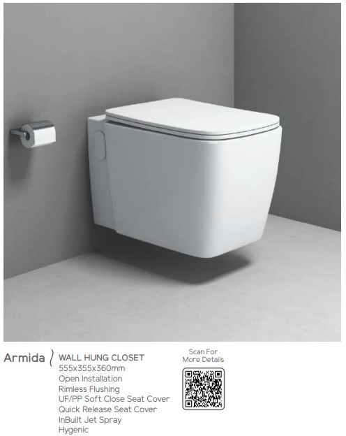 مرحاض ARMIDA المعلق مصنوع من بورسلان عالي الجودة، من إنتاج مصنع EROS – الهند، والمتوفر ضمن وكالتنا الحصرية. يتميز بتصميم مربع بسيط (Simple & Clean) ينسجم مع الحمامات العصرية ويمنحها مظهراً أنيقاً ومرتباً.