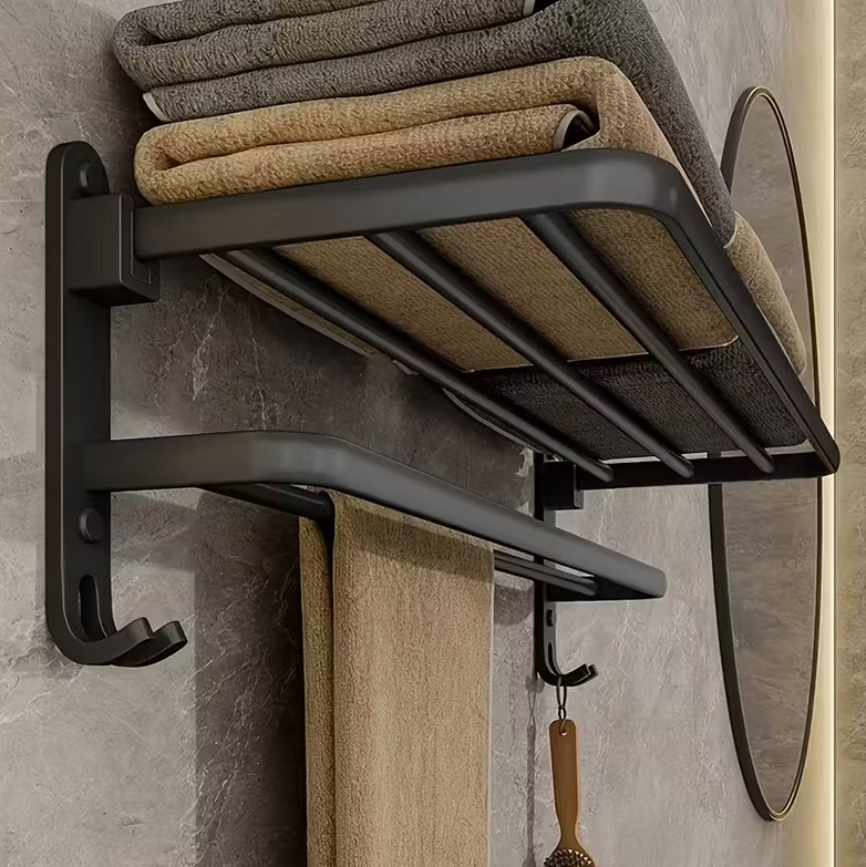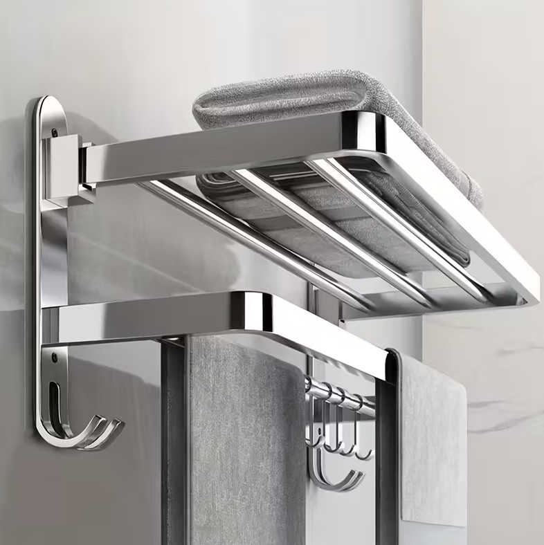 رف المناشف الحمام قابل للطي يثبت على الحائط، مصنوع الستانلبس، ويتميز بتصميم ذي مستويين مع خطافات إضافية.